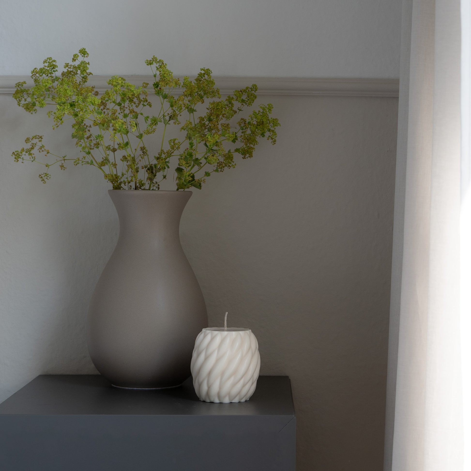 Handgegossen in Hamburg – aus europäischem Bio-Rapswachs und mit einem Docht aus 100 % reiner Baumwolle (RAL-zertifiziert). Die skulpturale Form entsteht in ruhiger Handarbeit und macht jede Kerze zu einem Stück minimalistischer Gestaltung – kompromisslos in der Linie, klar im Ausdruck.